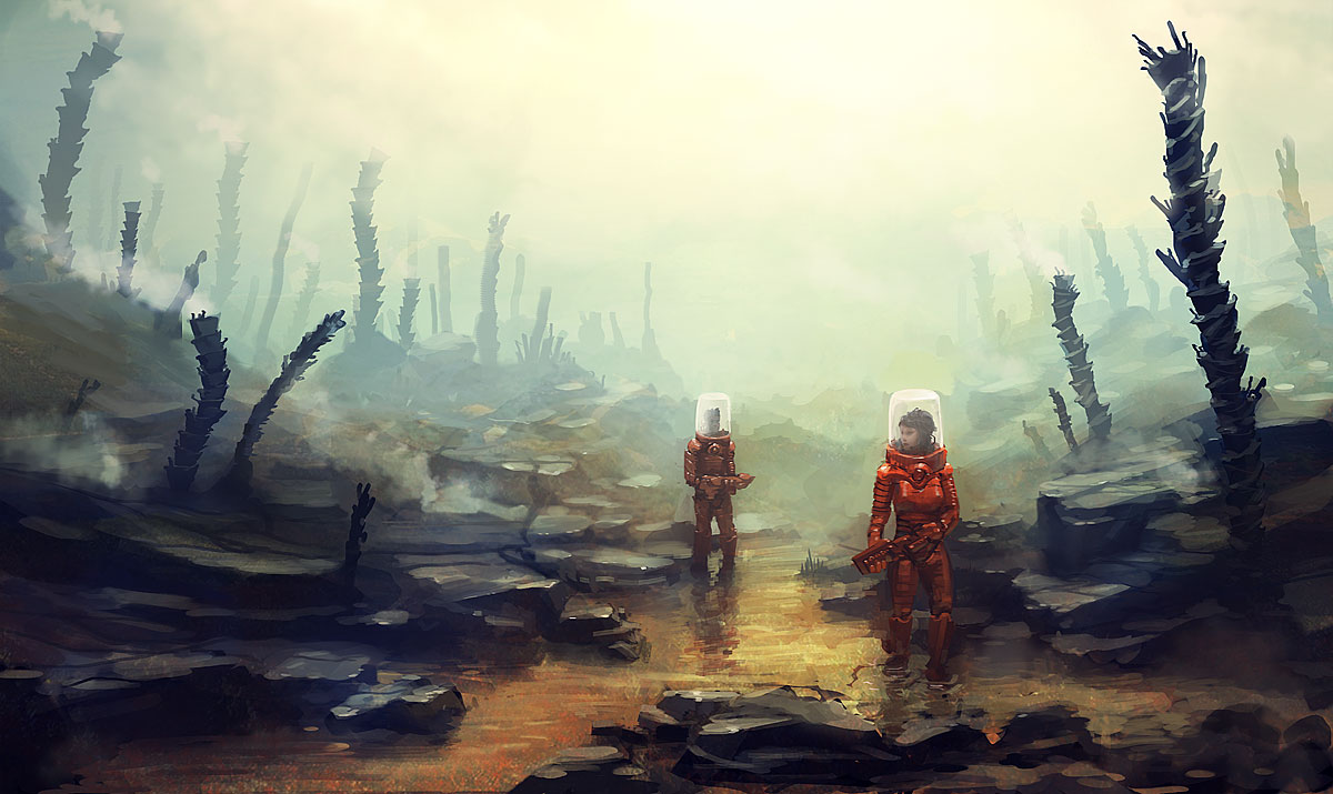 Both colonists wear Hostile Environment Suits due to high ambient Nitrogen levels. The standing colonist rests a soil spectrometer on his right thigh. Note original mission markings on the left shoulder pauldrons as well as the absence of firearms, hallmarks of the Optimist's School, of which this rendering is the best-known example.